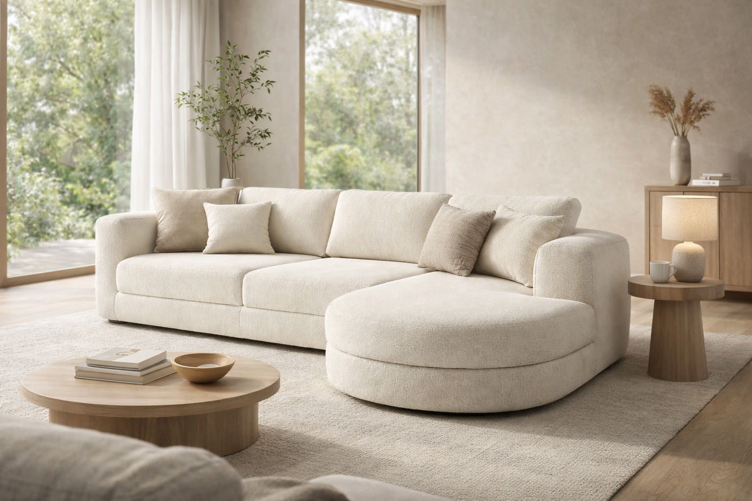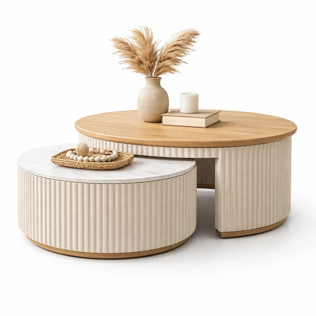 Stilvolles Couchtisch-Set mit runden Formen und harmonischer Kombination aus Holz und Strukturfronten. Ideal für ein modernes und gemütliches Wohnzimmer.