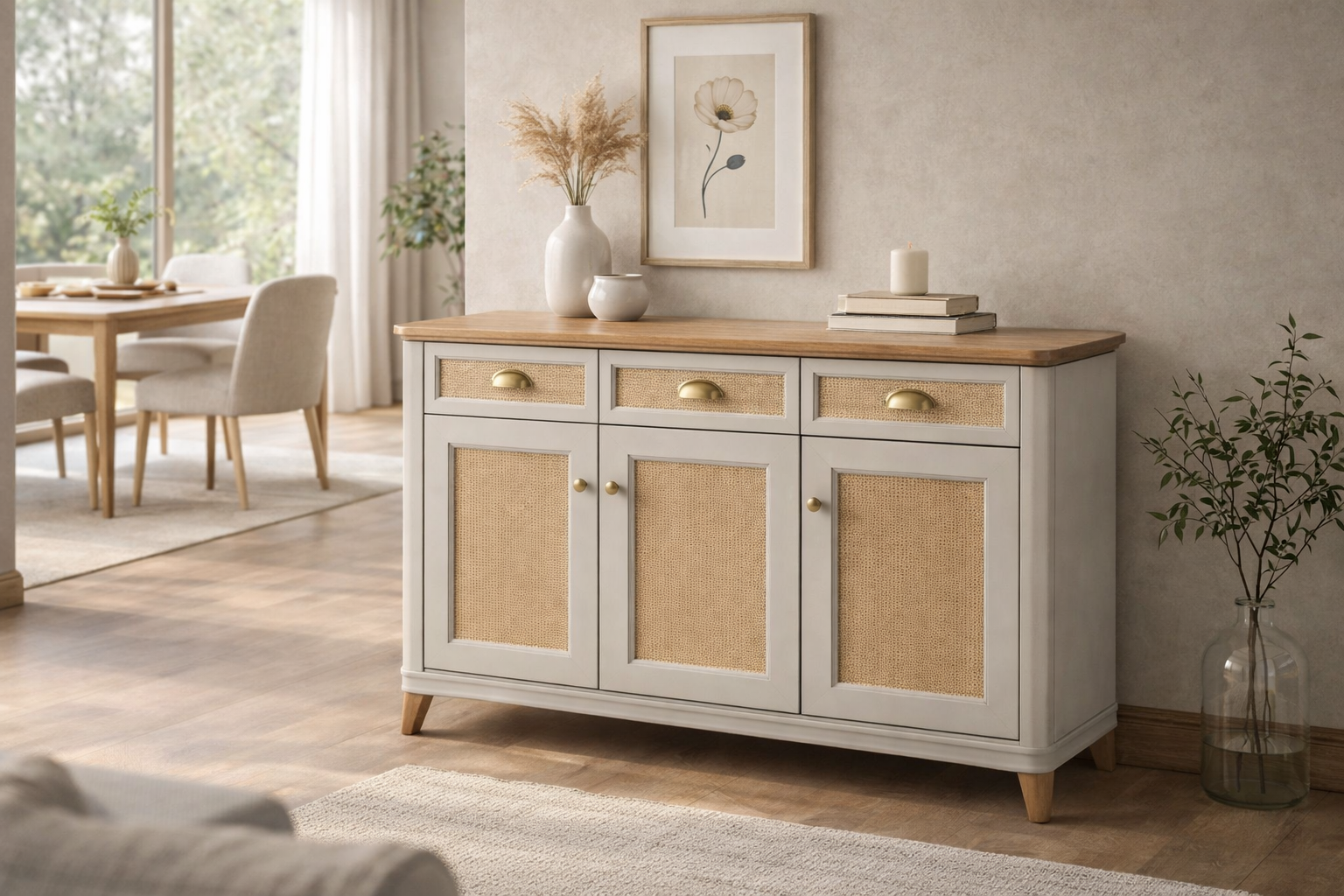 Stilvolles Sideboard in natürlicher Holzoptik mit dekorativen Rattan-Elementen. Ideal für zusätzlichen Stauraum und eine warme Wohnatmosphäre.